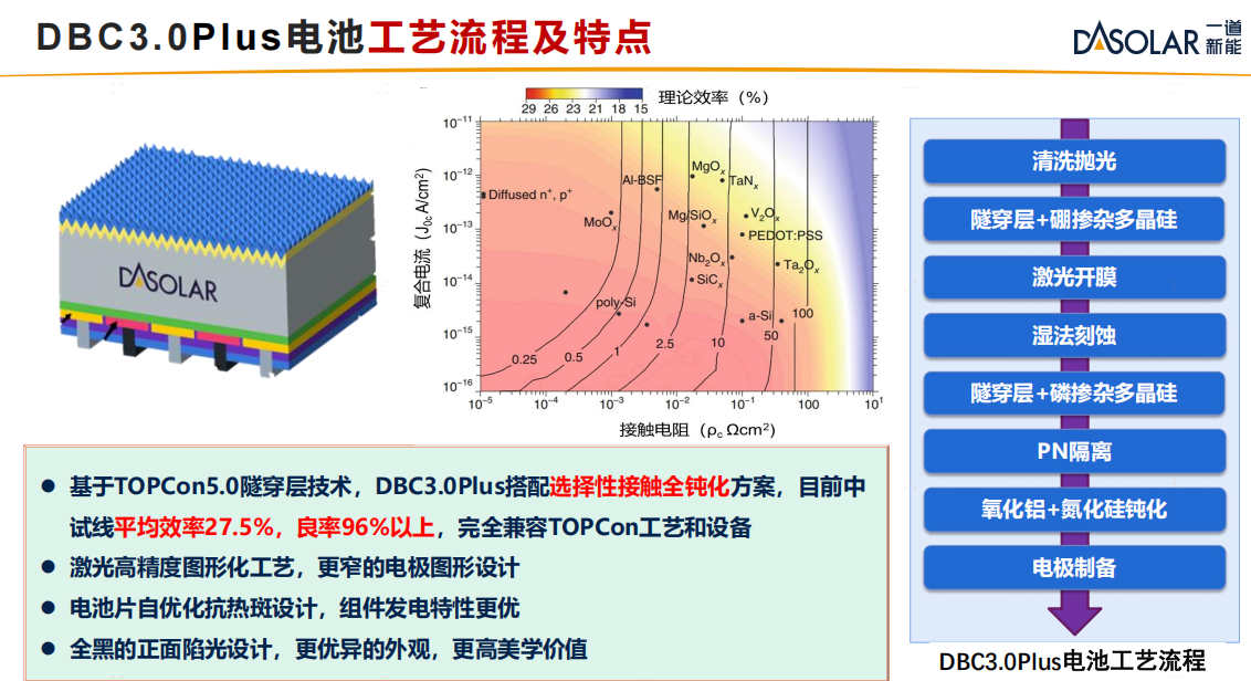 在光伏技術百花齊放多的當下,針對不同應用市場的技術多元化已成為衡量光伏企業綜合實力的核心標志。BC 技術憑借其高正面轉換效率與出色的外觀設計,在 BIPV 等細分市場展現出巨大應用潛力。隨著光伏技術與應用場景的深度融合,BC 正成為推動光伏產業向場景化和細分市場發展的新方向。一道新能依托其“一主三翼”前瞻性的戰略布局、深厚的TOPCon技術積累和卓越的創新能力,通過將 TOPCon 鈍化接觸技術與 BC 背電極架構相結合,形成了擁有自主知識產權的DAON-BC 技術(簡稱DBC)。歷經持續技術迭代,DBC 技術的發展路徑和應用場景清晰,現已從 DBC 1.0 階段演進到 DBC 3.0 Plus,第三方測試最高效率超過27.77%,具備引領行業發展的實力。
