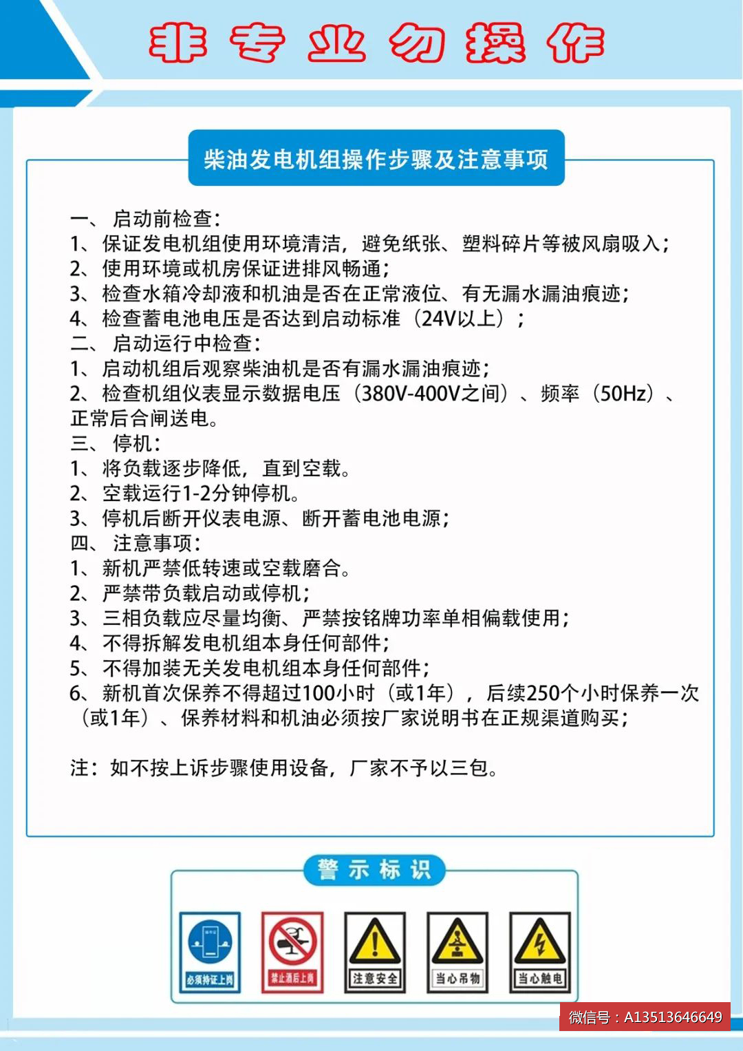 如機房內填加其他設備,須保持機組維護空間、進氣、排氣、散熱的正常。請務必仔細閱讀機組使用維護保養手冊,操作和維護必須由經過培訓的專業人員進行。