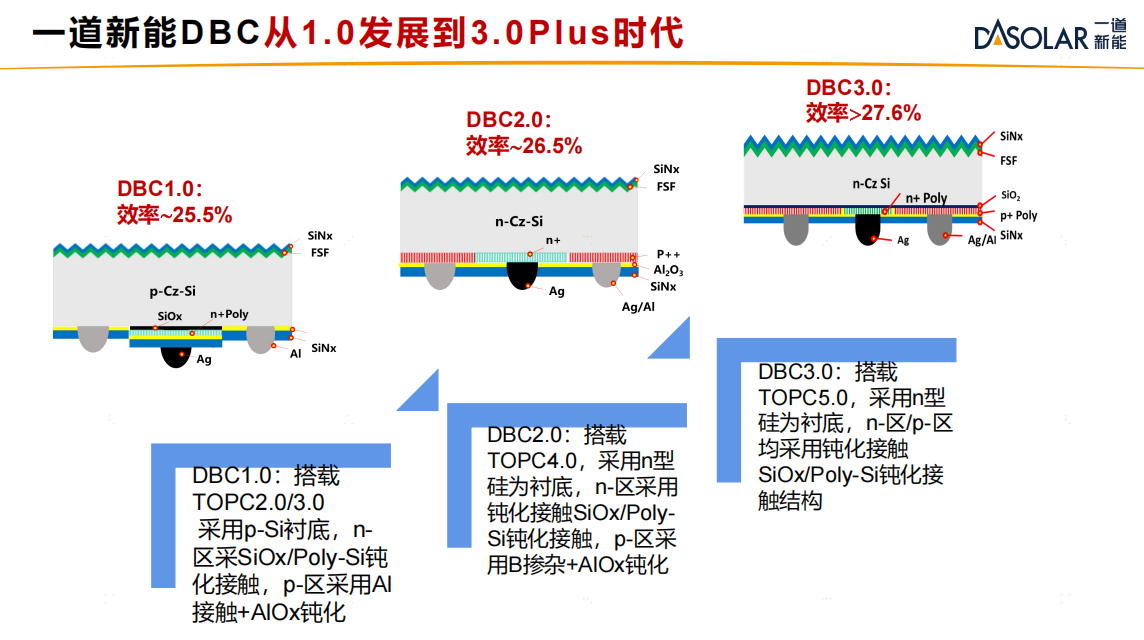 在光伏技術百花齊放多的當下,針對不同應用市場的技術多元化已成為衡量光伏企業綜合實力的核心標志。BC 技術憑借其高正面轉換效率與出色的外觀設計,在 BIPV 等細分市場展現出巨大應用潛力。隨著光伏技術與應用場景的深度融合,BC 正成為推動光伏產業向場景化和細分市場發展的新方向。一道新能依托其“一主三翼”前瞻性的戰略布局、深厚的TOPCon技術積累和卓越的創新能力,通過將 TOPCon 鈍化接觸技術與 BC 背電極架構相結合,形成了擁有自主知識產權的DAON-BC 技術(簡稱DBC)。歷經持續技術迭代,DBC 技術的發展路徑和應用場景清晰,現已從 DBC 1.0 階段演進到 DBC 3.0 Plus,第三方測試最高效率超過27.77%,具備引領行業發展的實力。